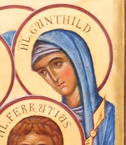 Die heilige Gunthild, unsere gotttragende Mutter, war eine fromme Jungfrau, die in der Nähe des angelsächsischen Klosters Wimborne in der heutigen Grafschaft Dorset in England aufwuchs. Der Überlieferung zufolge war sie eine Verwandte des heiligen Lullus, des ersten Erzbischofs von Mainz und engen Mitarbeiters des heiligen Bonifatius, Apostels der Deutschen.