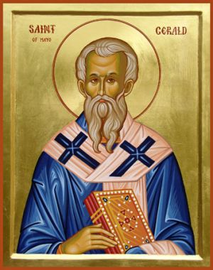 Um 642 in Northumbrien geboren, wurde Gerald Mönch in Lindisfarne. Im Jahr 664 begleitete er seinen Abt Colman zu einer Synode nach Whitby. Im Jahre 670 gründete Colman das Kloster von Mayo in Irland und setzte Gerald als dessen ersten Abtbischof ein. Er erwies sich trotz seines jungen Alters als weiser Abt und leitete das Kloster, bis er 697 zugunsten eines jüngeren Nachfolgers zurücktrat. Als dieser jedoch das Kloster wieder verließ, übernahm Gerald auf Bitten seiner Mitbrüder wieder die Leitung der Gemeinschaft, die er bis zu seiner Entschlafung 731 ausübte.