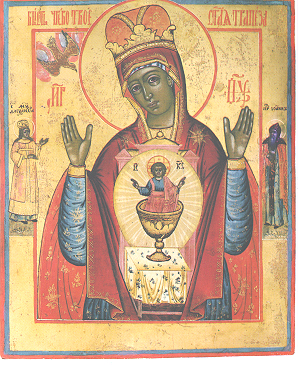 Ikonen-Typ: Von dieser Ikone gibt es zwei Varianten. Bei der ersten Variante steht der Kelch vor der Gottesmutter auf dem Tisch. Die zweite Variante zeigt den Tisch mit dem Kelch direkt am Körper der Gottesmutter.