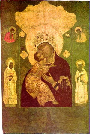 Der Name des Metropoliten Cyprian ist verknüpft mit der ersten Ankunft der früheren Vladimir-Ikone der Gottesmutter, (die) im Jahr 1395 von Konstantinopel nach Moskau (übertragen worden) war. Unter dem Metropoliten Gerontius kam die Vladimir-Ikone 1480 schließlich nach Moskau.