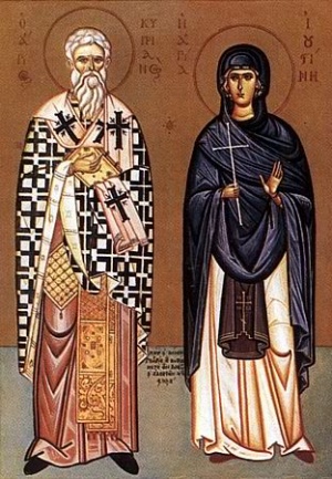 Der hl. Kyprian stammte aus Antiochia (heute Antakya) und war zuerst ein heidnischer Priester. Justina war Christin und galt als eine schöne Frau. Doch alle Heiratsanträge lehnte sie ab, da sie sich mit Christus verlobt hatte. Der abgewiesene Kyprian versuchte, sie mit allen Mitteln seiner Zauberkunst für sich zu gewinnen; sie aber widerstand allen Versuchungen und schützte sich jeweils mit dem Zeichen des Hl. Kreuzes, das sie über sich schlug. Kyprian erkannte seine Ohnmacht, bekehrte sich, wurde getauft, dann Diakon und schließlich Bischof von Antiochia. Durch die Diokletianische Verfolgung wurden beide ergriffen und um 280 nach Nikomedia gebracht. Nach schweren Marterungen wurden beide Heilige mit dem Schwert enthauptet. Mit ihnen starb als Märtyrer ein Soldat namens Theoktistos, überzeugt vom Christlichen Glauben der beiden Märtyrer. Dies geschah im Jahre 304 in Nikomedia (heut. Izmit).