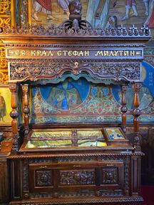 Stefan Uroš II. Milutin wurde 1253 als jüngerer Sohn von König Stefan Uroš I. und dessen Frau Hélène von Anjou geboren. Nach der Abdankung seines Bruders Dragutin bestieg er den Thron. Während seiner Regentschaft errichtete er 42 Kirchen, darunter Gračanica, Studenica, Staro Nagoričane, ebenso Kirchen in Konstantinopel, Thessaloniki, Sofia, Jerusalem, auf dem Sinai und auf dem Berg Athos. Er entschlief am 29. Oktober 1321. Seine Reliquien blieben unverwest und wirken Wunder, noch heute befinden sie sich in der Kathedrale Sv. Nedelja in Sofia.