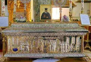 Lasst uns unseren Beschützer, den göttlichen Nikolaus, loben; Als einer, der mit gesegneter Tugend ausgestattet war, schien er als wahrer Priester des höchsten Gottes hervor und war Sein glühender Verehrer. Denn durch sein heiliges Leben auf Erden hat er uns die erhabenen, göttlichen und unfehlbaren Lehren von Langmut, Sanftmut, Geduld, ungeheuchelter Demut und wahrer gottähnlicher Liebe hinterlassen.