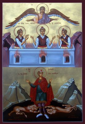 Unter dem Perserkönig Darios wurde der hl. Daniel in Folge von Verlеumdungen seiner Feinde in eine Löwengrube geworfen; doch Gott schloss den Rachen der Löwen und der Prophet blieb unversehrt. Der hl. Daniel starb in Persien; er verfasste ein Buch, in welchem er die Zeit der Erscheinung- des Messias genau weissagte. Als auf dem Felde Deir vom König Nabnchodonosor seine Statue aufgestellt war mit dem Befehl, ihr göttliche Ehren zu erweisen, wurden die 3 Jünglinge wegen ihrer Weigerung, dies zu tun, in einen brennenden Ofen geworfen, aber von Gott unversehrt in den Flammen bewahrt, und Nabuchodonosor selbst verehrte den wahren Gott. Später wurden diese 3 Jünglinge nach der Überlieferung unter dem Persischen König Kambyses enthauptet.