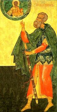 Nachdem du den Rang der irdischen Würde und Ehrenauszeichnung verlassen, bekanntest du vor dem tyrannischen hinterlistigen König Christus als Gott und ertrugest um seinetwillen viele Leiden, o Ruhmreicher. Deswegen bist du mit dem schönsten Siegeskranze geziert worden von dem über alle herrschenden König. Vor ihm stehend mit den Himmelsheeren glänzend geschmückt, bitte, o Sabbas, auf dass errettet werden unsere Seelen!