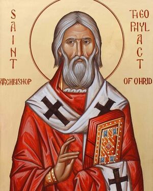 Theophylakt, Erzbischof von Ohrid, wurde auf der Insel Euripos (Euböa) geboren und in Konstantinopel von den hervorragendsten Lehrern jener Zeit ausgebildet. Als Priester der Großen Kirche wurde er zum Bischof gewählt und gegen seinen Willen nach Ohrid geschickt, wo er ungefähr fünfundzwanzig Jahre blieb (von ungefähr 1082 bis 1108). Chromatianos von Ochrid nennt ihn den „weisesten Erzbischof“. Ein Mann von enormer Gelehrtheit, sowohl säkular als auch theologisch, von feinem byzantinischen Geschmack, melancholisch und empfindsam, fühlte sich Theophylakt unter den Slaven wie ein Verbannter unter Barbaren. Er schrieb Kommentare zu den vier Evangelien und anderen Büchern des Neuen Testaments. Dies sind die besten Werke ihrer Art nach denen des hl. Johannes Chrysostomos, und man kann sie auch heute noch mit großem Gewinn lesen. Zu seinen anderen bekannten Werken gehören seine Briefe und das Leben des hl. Kliment von Ohrid. Im hohen Alter zog sich der hl. Theophylakt von Ohrid nach Thessaloniki zurück, wo er sein irdisches Leben zu beenden gedachte und seine Wohnstatt in der gesegneten Ewigkeit einnahm.
