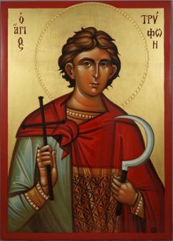 Tryphon (Trifon, Trifun) wurde in Lampsakos in Phrygien als Kind armer Eltern geboren. Der Legende nach einfacher Gänsehirt, aber begabt mit der Gnade, alle Krankheiten von Menschen und Tieren zu heilen und unreine Geister zu vertreiben. Als er 17 Jahre alt war, befreite er die Tochter Kaiser Gordians von einem Dämon. Als Decius Kaiser wurde brach eine Christenverfolgung aus, so wurde Tryphon beim Präfekten in Nicäa angezeigt, schwer gefoltert und enthauptet. Sein Martyrium erlitt er im Jahre 250. Seine Reliquien befinden sich seit dem 9. Jahrhundert in Kotor (Montenegro), wo er als Stadtpatron verehrt wird.