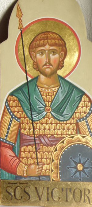 Der hl. Viktor mit seinen Gefährten gehört zu den Märtyrern aus der thebäischen Legion und erlitt sein Martyrium in Xanten, wo sich seine Reliquien in der Krypta des Domes befinden.