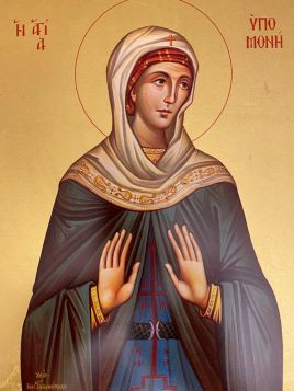 Lasst uns die berühmte Königin preisen, die heilige Ypomoni, die fromme Taube die von der verworrenen Welt in großer Liebe zum Himmel geflogen ist, die wir mit Askese und Demut rufen: Bitte, Mutter, zerbrich durch deine Gebete die Fesseln unserer Sünden.
